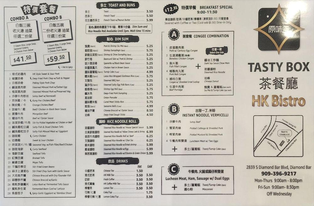 Tasty Box HK Bistro is a hidden gem in Diamond Bar, CA, offering delicious Cantonese cuisine with a focus on dim sum and barbecue dishes. The restaurant provides takeout, reservations, outdoor seating, and catering services, making it a versatile dining option. Customers rave about the flavorful and fresh ingredients used in their dishes, such as the spareribs with black bean sauce and pork and shrimp siu mai. The crispy garlic pork knuckle and French-style filet mignon cubes are also highly recommended for their taste and portion sizes. Tasty Box HK Bistro also offers traditional HK milk tea and family-style combos for great value. With friendly staff and a clean, organized environment, this restaurant is a must-visit for lovers of Hong Kong-style cuisine.